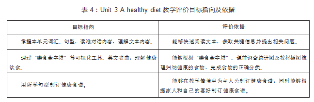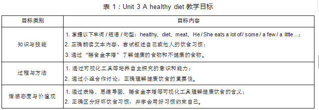 以牛津译林版小学《英语》六年级(下)Unit 3 A healthy diet为例,制订如下单元教学目标(见表1)。这些教学目标根据《课程标准》的指示和要求设定,涵盖知识与技能、过程与方法、情感态度与价值观三大维度。各个教学目标之间相互关联,层层递进,形成了一个有机的整体。