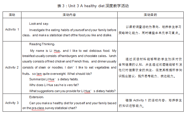 在Activity 1中,教师要求学生在课前调查自己和家人的饮食习惯,并完成统计图。这一活动旨在建立英语学科与学生日常生活的联系,加强他们对英语学科的认知,并为课堂教学打下基础;Activity 2通过阅读理解材料引发学生的深度思考,引导他们根据阅读内容和实际情况提出合理建议,以促进其思维能力的发展;Activity 3则与Activity 1相衔接,围绕“家庭健康食谱”这一主题丰富学生应用英语知识的场域,并培养他们的知识迁移和应用能力。