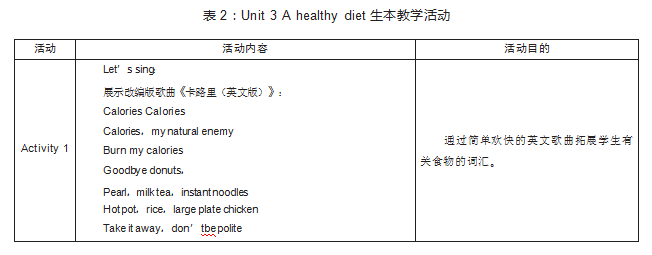 基于上述学情分析,立足生本视角,以教学目标为导向,设计出系列化的教学活动(见表2)。如表2所示,三个活动均具有较强的趣味性,能够体现《课程标准》的生本思想理念。其中,Activity 1通过英文歌曲的方式引出教学主题,吸引学生的注意力,让他们在轻松愉快的氛围中进行英语实践活动。Activity 2在Activity 1的基础上开展,要求学生融合本单元的新单词改编歌曲。完成歌词改编后,教师要求学生以组为单位上台分享,不仅能够培养他们的自主探究和合作交流精神,还能够打开他们的学习思路。Activity 3则通过情境教学法培养学生解决问题的能力,要求他们根据需求为运动健儿制订健康饮食食谱,并自觉将健康饮食食谱践行到自己的日常生活中。