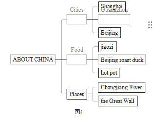 以Lesson 3为例,教师在阅读教学中可以先让学生观察文章中的插图和标题,并预测文章内容。学生推测这篇文章是介绍中国的。接着,教师可让学生阅读文章并回答问题“What aspects does the article introduce to China?”。学生在阅读后根据段落分析可知,文章从城市、景点和食物三方面介绍了中国。为了清晰地理解文章的结构和内容,学生结合问题“What are the other cities in China?”“What are some of the most famous scenic spots in China?”“What is the point of Chinese food?”在文章中找到答案。而后,教师可引导学生以思维导图的方式将有关中国的介绍展示出来(如图1)。