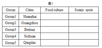 在实际教学中,教师可基于真实事件为学生设置问题,让学生在小组交流和合作中围绕中华优秀传统文化进行探究。例如,教师在讲授完Lesson 3后可以将学生分为5组,让学生共同研究问题:Take a certain city as an example to explore the scenic spots and delicious food in Chinese cities,Introduce the food culture and landscape in English。每个小组集中讨论一个城市的文化知识,并在讨论后填写表1。