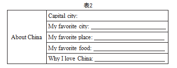 例如,教师可以组织以“Chinese Culture in My City”为主题的角色扮演活动。具体而言,教师可以将学生分为5组,每组4~6人,分别扮演外国友人和本地人。扮演本地人的学生需要在活动中采访扮演外国友人的学生对中国文化的认知情况并填写问卷(见表2)。例如,扮演本地人的学生可以提出“What's your favorite city in China?”“What is your favorite food?”等问题。扮演外国友人的学生需要回答“My favorite city is...”“My favorite food is...”。在角色扮演活动中,学生可以进一步理解传统文化,并在交流中增强文化自信。