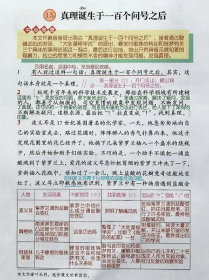 例如,在《真理诞生于一百个问号之后》的教学中,教师可引导学生分析文章的论证结构。教师先引导学生找出文中的论点——“真理诞生于一百个问号之后”,然后梳理作者为证明这一论点所列举的三个事例——波义耳发现植物酸碱反应并发明出石蕊试纸、魏格纳通过观察地图提出“大陆漂移说”、阿瑟林斯基发现脑电波的变化与做梦的关系。随后,教师提问:“作者为什么选择这三个事例来证明自己的观点?这些事例有什么共同点和不同点?”学生通过讨论发现,这三个事例虽然来自不同的科学领域和事件,但是都体现了科学家从细微的现象中发现问题、不断追问,最终找到真理的过程。接着,教师继续引导学生思考:“这些事例是否足以证明论点的普遍性?有没有其他反例存在?”这一问题能够激发学生的批判性思维。有的学生提出:“虽然这三个事例很有代表性,但也许还有其他情况,真理的发现不一定都需要经过一百个问号,可能通过更少的疑问就能发现真理。”这样,通过对文本的深度挖掘和思考,学生不仅能更好地理解课文内容,还能锻炼思辨能力。