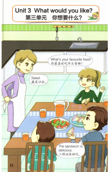 问题导向教学强调以真实问题驱动学生学习,使学生在解决问题的过程中实现知识的自主建构与迁移应用。由此可见,以链式问题驱动小学英语单元整体教学的模式高度契合《义务教育英语课程标准(2022年版)》(以下简称《课程标准》)对核心素养的要求,即通过语言学习培养学生解决实际问题的能力[1]。小学阶段的学生正处于知识拓展、价值形成与习惯养成的关键期,如何引导其将语言学习与生活实践相结合,是英语教学的重要课题。外研版英语五年级(上册)Unit 3 What would you like?以“饮食”为核心话题,涵盖点餐用语、食物分类、健康饮食等内容,与学生的日常生活联系紧密。本单元的教学若仅停留在传统教学模式下的词汇与句型操练,则容易流于表层,难以达成培养学生利用所学知识解决实际问题的能力。由此,本文以链式问题为导向,聚焦“健康饮食选择”这一生活场景,通过单元整体设计,帮助学生从“点餐交际”走向“饮食规划”,在语言运用中掌握营养学知识,培养理性决策能力,并借此探究问题导向的单元整体教学设计与实施路径。