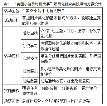 在进行“美化处理图片”的教学时,教师可以组织学生开展“美图小能手比拼大赛”项目化综合实践活动。在此之前,教师应先对该部分内容进行细致解读,确定学习目标和重难点,并结合实际学情设计项目化综合实践活动方案(见表1)。需要注意的是,方案不仅要包括具体的活动内容,还要细致呈现实施步骤及所需资源,以在最大程度上确保项目的可行性。