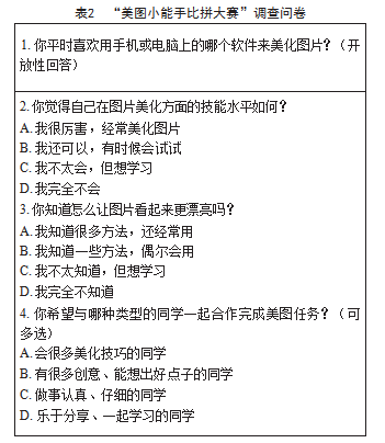 在“美图小能手比拼大赛”项目化综合实践活动的实施阶段,教师可通过发放调查问卷(见表2)的方式了解学生对“美图”的认知,并结合学生在课程中的实际表现,将综合能力不同的学生分为不同的层次,再以“组内异质,组间同质”为原则,将学生分为若干活动小组。