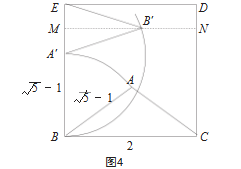 在已经折叠出腰AB=√5-1、底BC=2的钝角黄金三角形ABC的正方形纸片上,以B为圆心,BA为半径作弧交BE于点A',则BA'=BA=√5-1。由于正方形纸片的边长BE=2,此时在线段BE上