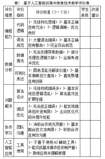 人工智能技术在教学评价中发挥着重要作用。传统评价方式依赖人工批改与总结反馈,存在滞后性。智能评价工具可基于学生的行为数据生成动态分析,精准定位学生的薄弱环节,为教学调整提供依据[5]。例如,在教材各单元末的学习评价板块,教师可运用简易算法实现自动化批改,并结合错题统计生成针对性练习,形成“评价—反馈—强化”的闭环(见表1)。