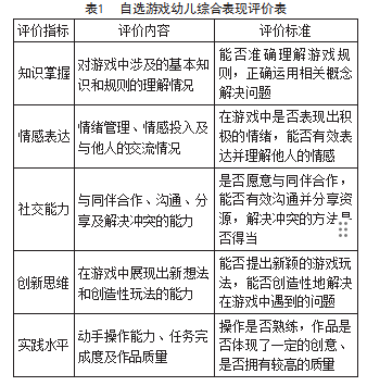 以自选游戏为例,教师应摒弃传统单一、片面的评价标准,既要关注幼儿在游戏过程中的知识掌握情况,又要从情感表达、社交能力、创新思维、实践水平等多个层面来评估幼儿的真实表现(见表1)。后续,教师可再基于观察内容和反馈结果对幼儿实施个性化指导,并及时调整自选游戏的内容和实施策略。