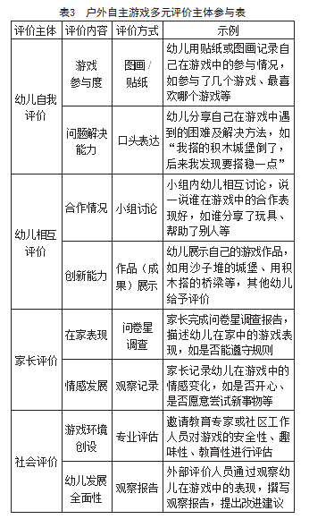 例如,在组织幼儿开展户外自选游戏的过程中,教师可鼓励幼儿、家长及其他相关人员参与评价。评价主体多元化,一则可提升评价的全面性,从不同角度、不同层面反映幼儿的发展状况,让评价结果更加全面立体;二则可通过鼓励幼儿进行自我评价和相互评价,培养幼儿的自我认知和社交能力;三则可通过让家长参与评价,在增进家园沟通理解的同时,形成教育合力;四则可通过社会评价为幼儿教育提供外部监督和有效反馈,以促进幼儿教育的可持续发展。具体来说,教师可从幼儿自我评价、相互评价、家长评价及社会评价四个方面落实(见表3)。