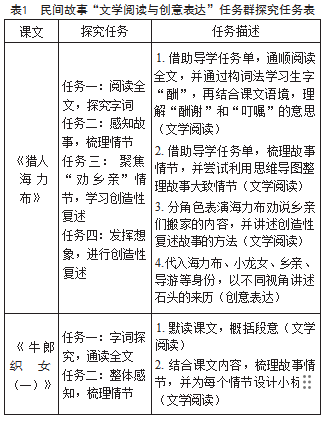 以统编语文五年级(上册)第三单元的教学为例,本单元的人文主题是“民间故事”,收录了《猎人海力布》《牛郎织女(一)》《牛郎织女(二)》等课文。教师可以“讲好民间故事,传承百姓智慧”为主题,开展“文学阅读与创意表达”学习任务群活动,并为学生设计多个学习探究任务(见表1)。