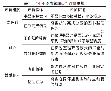 例如,在“小小图书管理员”活动中,教师可制订以下评价量规(见表1)。