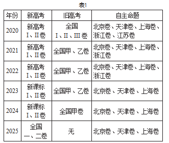 从表1可以看出,我国自2020年开始新高考试点以来,截至2024年都是新旧高考并存的局面,直到2025年全国卷才开始全面使用新高考题型。除了全国卷,自主命题的地方也有所减少,2023—2025年自主命题的地区仅剩除重庆外的三个直辖市。