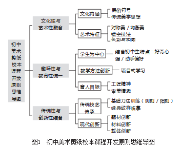初中美术校本课程开发中,将剪纸艺术融入其中,并非随意地堆砌组合,而是需要教师遵循一定的原则来进行的,主要有以下三个方面:其一,坚持文化性与艺术性相融合,将剪纸艺术融入美术校本课程开发中。教师要深入挖掘剪纸艺术中所蕴含的深厚的民俗文化符号、传统美学等,将解读龙凤呈祥、连年有余等传统经典的剪纸纹样的寓意,与赏析剪纸的对称美、镂空美等艺术特征相结合,使学生在创作的过程中感受传统文化的魅力。其二,确保趣味性与教育性相统一,兼顾课程的吸引力和育人目标。教师要立足于初中生好奇心强、乐于实践的学习特点来采取多元化的教学方法,将学生对传统技法的学习融入具象化的趣味情境中,在寓教于乐、寓学于乐中培养学生的美术素养。其三,推动传统性和创新性相结合。教师在引导学生传承传统剪纸技法的基础上,还要鼓励学生适当创新,用现代的视角重新演绎传统技艺,以促进传统技艺在新时代的创造性转化、创新性发展(见图1)。通过这三大原则的相辅相成,既守护传统民间剪纸的文化根脉,又激发美术课程的时代活力,使学生既能够传承传统文化,又能够在实践创新中树立文化自信,成长为兼具民族情怀与现代视野的新时代人才。