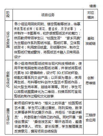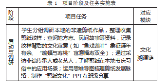 依然以《书中民艺》为例,教师可以设计“让剪纸走进现代生活——校园非遗文创设计行动”的项目主题,项目全程以“如何将传统剪纸艺术与现代设计需求结合,创作出兼具文化内涵与实用价值的作品?”为核心问题,为学生设计如下项目任务,并带领学生以小组合作的形式开展任务探究,实现传统剪纸艺术在现代生活中的创新表达(见表1)。