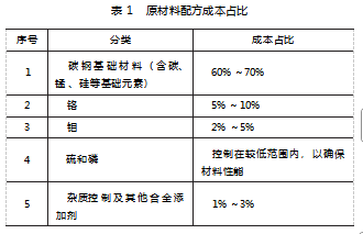 (1)原材料成本。ZG270-500的原材料配方通常由以下几种元素组成:碳(C)、锰(Mn)、硅(Si)、磷(P)、硫(S)、铬(Cr)、钼(Mo)等。这些元素的比例对铸件的性能有重要影响,常见的配比如下(以每吨材料的成本计算),见表1。