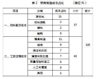 以装载机某桥壳的砂型铸造为例,ZG270-500的总制造成本可以大致分解为材料配方成本和工艺过程成本,见表2。
