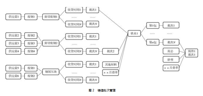 按原材料供商、材料分类、时间等区分材料批次;按材料批次、其他辅助材料、月度等区分铁水批次;按铁水批次、泥芯、砂型、月度等区分铸件批次,见图2。