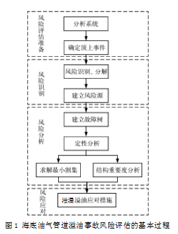 海底油气输送管道由于长时间暴露在恶劣的海洋环境中,其工作载荷、环境载荷和意外风险载荷均比较复杂,且运行时间比较长,发生泄漏失效的概率比较高[2]。基于故障树分析法(FTA),以风险评估准备、风险识别、风险分析及风险应对等4个方面简要分析海底油气管道溢油事故风险,期望对海底油气管道各阶段风险管控工作提供参考。