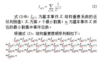 本文近似判断最小割集结构重要度顺序,其中在少事件最小割集中出现次数少的与多事件最小割集中出现次数多的基本事件,可由式(1)近似判别式计算: