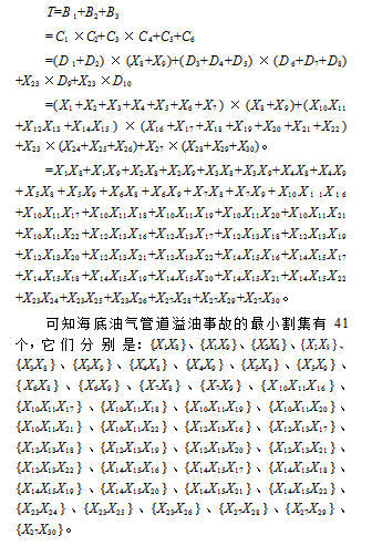 故障树中导致顶上事件的布尔逻辑组合低阶事件叫割集。能够导致顶上事件发生的最低限度的布尔逻辑组合低阶事件称为最小割集。基于建立的故障树,通过反复运用布尔代数运算法则进一步简化、计算,可以分析造成事故发生的原因[4]。由海底油气管道溢油事故故障树的逻辑关系,得到结构函数如式: