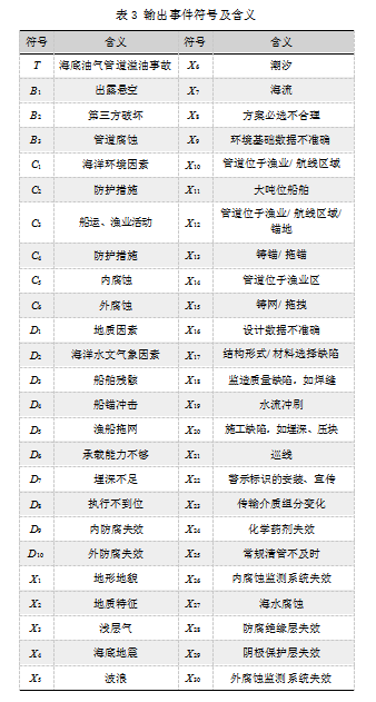 由海底油气管道溢油事故风险源识别,将引起管道溢油事故因素分为扰动程度、安全属性、预防措施等,并将其作为中间事件,逐级分析原因,分解至基本事件。故障树的基本符号及含义如表2所示,海底油气管道溢油事故故障树分析如图2所示,输出事件符号及含义如表3所示。