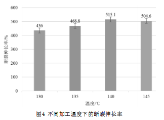 拉伸强度增大的原因在于,当温度处于130~140℃时,随着温度的升高,淀粉分子链的运动逐渐增强,TPS淀粉的结晶区域发生相应变化,并且体系中的增塑剂能够更有效地分散,这些因素共同提高了材料的柔韧性,进而使得拉伸强度增大。而拉伸强度下降的原因是,随着温度持续升高,分子链运动持续增强,导致分子间作用力减小,同时增塑剂会从材料中逸出,TPS淀粉也会发生热降解,最终致使拉伸强度降低。
