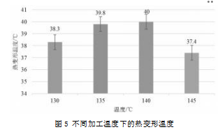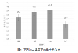 根据图6可以看出,该注塑制品维卡软化点随着加工温度的升高先增大再减小,加工温度达到140℃时,该注塑制品的维卡软化点达到最大,为69.2℃。维卡软化点增大,在高温度下加工不易软化变形,有助于提高加工精度和制品质量,更为重要的是高温下材料的机械性能往往会下降,但高维卡软化点的材料仍能保持较好的机械性能,在高温应用中更为可靠。