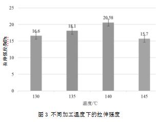由图3能够看出,TPS/PBAT共混吹膜后,其拉伸强度性能呈现出如下变化规律:随着挤出时加工温度的升高,拉伸强度从初始130℃时的16.6 MPa提升至140℃时的20.58 MPa,提升幅度达到了23.9%。然而,当加工温度进一步提升至14℃时,拉伸强度出现明显下降,降至15.7 MPa,拉伸性能降低了31.1%。由此可知,拉伸强度在挤出加工温度为140℃时达到最优状态,此时拉伸强度为20.58 MPa。在挤出加工温度处于130~145℃这一区间内,拉伸强度先是随着加工温度的升高而增大,待达到某一临界点后,则开始减小。