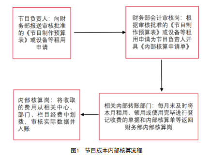 各部门和节目使用台内机房、演播室、转播车、灯光、租机、领用磁带等必须事先向财务部报送经审核批准的《节目制作预算表》。财务部根据审核批准的《节目制作预算表》,为其节目负责人(制片人或编导)填写《内部核算申请单》,作为准予其转账付款的凭据。台内各有关部门的内部转账收费结算单必须附财务部填制的《内部核算申请单》的相关联一并交财务部,由财务部将其收取的费用从有关中心、部门、栏目经费中划拨(见图1)。