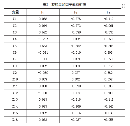 根据各个公因子的方差贡献率占3个公因子总方差贡献率的比重作为权重,构建综合因子得分计算公式:F=0.662F1+0.260F2+0.078F3