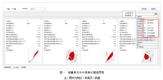 智能可视化技术是内部储量数字化管理系统的一大亮点,通过先进的可视化技术,将复杂的储量数据与图表巧妙地整合为“储量单元卡片”。每张卡片犹如一个独立的信息窗口,代表着一个油气储量计算单元,包含了含气面积、孔隙度、渗透率、含油(气)饱和度、流体性质、地质储量等多维度的油气藏相关参数(见图1)。