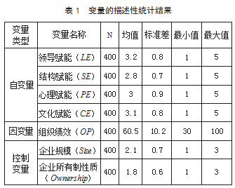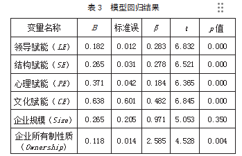 回归分析结果如表3所示。从表3可以看出,在控制了企业规模和所有制性质后,领导赋能(LE)、结构赋能(SE)、心理赋能(PE)和文化赋能(CE)对组织绩效(OP)均有显著的正向影响,回归系数分别为8.2、6.5、7.0和6.8,这进一步验证了我们的研究假设H1-H4。