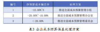 由表3可知,企业成本预算偏差处理为分级处理模式,根据净预算成本偏差率采取不同的处理措施。
