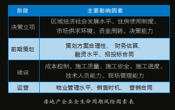 近年来,我国房地产行业保持着健康稳定的发展态势,整体成效显著,但也逐渐显现出一些风险,比如区域性差异突出、部分城市商品房库存积压、价格波动风险加大等,这些因素让部分房企的财务风险有所加剧。对房企而言,依托全生命周期理念开展系统性的财务风险管理,是规避内外部风险、保障企业稳健发展的必由之路。从这一理念出发,结合房地产项目各阶段的运营内容与特征,可将其划分为四个阶段,各阶段涉及的财务风险因素详见表格所示。