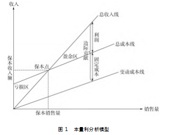 本量利分析模型见图1,总收入线与总成本线的交叉点为保本点,即不盈不亏。如实际销售量大于保本点时,则处于盈余区;反之,则处于亏损区。