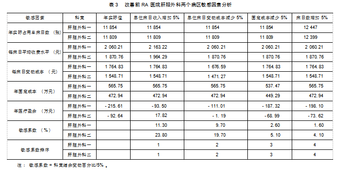 为探究RA医院肝胆外科在现有业务基础上,增加科室盈余最有效的关键因素,假设各相关敏感因素每变动5%,分别计算两病区收支结余变化情况,并对各相关因素敏感程度进行依次排序,测算结果见表3。