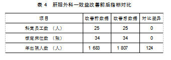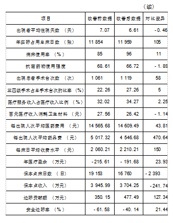 经过一年的努力和改进,RA医院肝胆外科各项经济效益指标有了明显的提高。改善后其门急诊收住院率从原先的10.50%上升至13.70%,特别是原先运营效益相对落后的肝胆外科一,成效更加显著(见表4):出院者平均住院天数从原先的7.07天减少至6.61天,出院患者手术台次从1 061次增加至1 119次,特别是三、四级手术占比从22.26%增长至27.26%,病床使用率从85%增长至96%,本地患者外流减少,业务指标明显趋好。同时,肝胆外科一每出院人次平均药费从5 017.32元降至4 546.68元,每100元医疗收入所消耗卫生材料从27.56元减少至26.42元,且其医疗服务收入占比从32.02%提升至34.27%,年实际占用总床日数同比增加105张,病床使用效能和科室安全边际率得到进一步提升。虽还未实现科室结余扭亏的目标,但其医疗收入结构趋于优化,亏损面也在缩小。