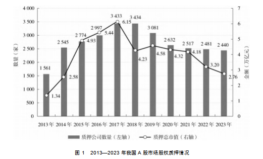 随着我国资本市场朝着多层次、全方位方向发展,上市公司的融资方式也呈现出多元化趋势,近年来受经济下行压力的影响,我国许多企业仍然面临融资难、融资贵等问题。相较于传统的股权融资、债券融资,股权质押具有流动性强、易变现、业务办理流程简单的天然优势,因此在资本市场上受到很多控股股东、大股东的青睐。1995年我国在《担保法》中就首次规定,公司可以利用股权质押进行融资,但当时主要是场外质押,银行和信托公司垄断了大部分质押业务,手续复杂且对质押股东的股权质量要求较高,所以整体股权质押的规模比较小。直到2013年5月,上海证券交易所与中国证券登记结算有限责任公司推出《股票质押式回购交易及登记结算业务办法(试行)》,我国正式启动场内股票质押式回购业务,允许证券公司承接股权质押业务,股权质押才开始不断发展。2018年、2025年上交所对这一办法先后进行了修订和完善,从初始质押标的、质押比率、业务运作等方面对股权质押行为进一步规范,为股权质押在资本市场的开展奠定了制度基础。东方财富网数据中心对股权质押数据的统计数据显示,截至2024年末A股上市企业中有2 313家公司进行股权质押,质押笔数为1.54万笔,质押总股数为3 244.52亿股,质押总市值达到2.80万亿元。