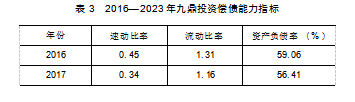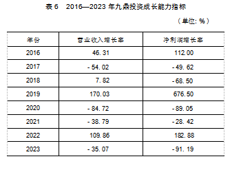 2016—2023年九鼎投资成长能力指标见表6。从表6可以看出,其2016—2023年营业收入增长率和净利润增长率波动较大,2019年和2022年两个指标较好,主要是基于这两年九鼎投资对已投私募项目的退出、套现,同时房地产业务达到交付条件,有大量营业收入确认,剩余年份成长能力表现较差,尤其是2017年和2020年。九鼎投资两项成长能力指标的波动下降一定程度上是受行业和经济下行的影响,但其中最主要的原因仍是中江集团大规模的质押行为带来了消极影响,股权质押所获得的资金也并未用于公司运营,九鼎投资的经营状况迟迟未能改善,致使企业缺乏成长能力。