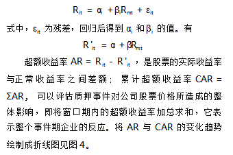 第三步,计算超额收益率和累计超额收益率。实际收益率包括九鼎投资的日收益率R it和上证A股日收益率R mt,九鼎投资的日收益率主要是通过t日减t-1日的收盘价除以t-1日的收盘价,同样市场日收益率也是用上证A股指数m日减m-1日的收盘指数除以m-1日的收盘指数;预期收益率R'it是指假设在没有进行股权质押的日期九鼎投资的正常收益率。以事件日前60天作为估计期来计算预期收益率,并剔除所有休息日的数据,即为T(-65,-5)。本文主要采用市场模型法,公式为