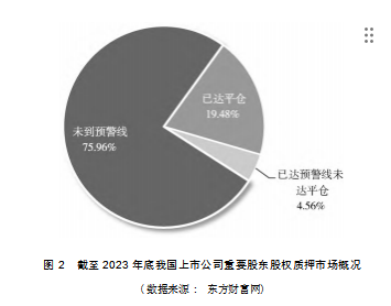 随着资本市场的不断发展,股权质押现象逐渐普遍。一方面,2013年5月我国正式启动场内股票质押式回购业务后,因其无须抵押实物资产的便捷性和相对宽松的监管环境,吸引了大量上市公司参与股权质押。2013—2023年我国A股市场股权质押情况见图1。由图1可知,我国质押总市值从2014年的2.58万亿元上涨到2015年的4.93万亿元,增幅高达91.27%,说明股权质押这种新型的融资方式得到了我国上市公司的偏好。从2016年起,金融监管部门加大去杠杆,信托、影子银行等非标融资渠道收紧,大量企业尤其是民营上市公司转向股权质押融资,于是2017年、2018年的质押总市值和质押公司数量分别达到最大值。另一方面,2018年众多企业出现“无股不押”的状况,部分大股东质押比例超80%,甚至接近100%,过高的质押比例增加了平仓风险。同年,乐视网、东方园林等案例暴露质押爆仓风险,引发监管关注,因此证监会发布明确规定和相关政策对我国上市公司股权质押行为进行进一步的监督与管理。2018年股份回购新政出台,多家公司主动回购股份,退出股权质押的行列,股权质押的发展步伐放缓,侧面反映出市场开始加强监管力度,协调融资渠道,使质押规模与风险逐渐趋于平稳[3]。截至2023年底,A股市场中有2 440家公司进行股权质押,质押笔数1.61万笔,质押总股数3 533.14亿股,质押市值高达2.76万亿元。其中重要股东股权质押(即指大股东股权质押)有4.56%已达预警线但未平仓,有19.48%已经处于平仓的状态(见图2),随时可能会面临股票被强制平仓的风险,相关的质押方主要集中在券商、银行、信托投资公司等金融机构。
