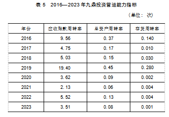 中江集团频繁股权质押使得营运能力出现下降(见表5),除2019年出现一定幅度的上升外(理由同前),2016—2023年九鼎投资三大营运能力指标总体一致向下,在股权质押频繁的2017年和2020年降幅尤其明显。应收账款周转率反映了企业应收账款转化为现金或其他流动资产的能力。结合九鼎投资逐年下降的应收账款周转率和其年报中披露的逐年提高的坏账计提比率,不难得出频繁的质押行为导致了公司坏账增多,账款回收能力下降的结论。与此同时,九鼎投资的总资产周转率也逐年下降,且一直处于比较低的水平,反映了企业利用其资产进行投资的效率较低。由于九鼎投资的核心业务是私募股权投资,房地产业务自2019年后未有新盘开出,业务本质决定了其2020—2023年存货周转率连续4年接近0。