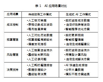 生成式AI对财务工作产生了变革性影响,与传统财务工作模式相比,生成式AI以其高效精准等特性,在成本控制、预算管理、风险管理及决策支持这4个场景中实现了效率与精准度的提升。表1清晰对比了传统财务工作模式与生成式AI工作模式在这4大应用场景的核心差异。