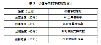 传统的考核体系侧重流程执行效率,显然已不能满足AI时代的职业发展需求,企业应更加科学、合理地评估财务人才培养效果。依据《新一代人工智能发展规划》提出的“建立人工智能标准体系,完善测评评估制度”要求,在考核指标设计中应减少传统指标如数据录入正确率、数据报表提交及时性等,更加侧重于创新和战略价值的实现。表3构建了价值导向的考核机制设计框架,在效率、质量、战略与创新4个维度下对财务人员进行全面评估,突破了传统考核对流程执行效率的单一关注,旨在优化和量化AI时代下财务人员的考核指标。