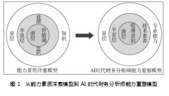 尽管这些成果为单维度能力提升提供了依据,但仍然缺乏系统性的能力重塑整合框架。因此,本文引入Boyatzis[19]提出的能力素质洋葱模型作为理论分析框架,该理论源于McClelland的素质冰山模型,并通过分层解构能力要素发展为系统性分析工具[20]。本文通过该模型将职业能力划分为“显性知识层—半显性技能层—隐性价值层”的渐进结构,能够系统整合财务分析师在AI时代的能力重塑全要素,弥补现有研究的不足,并且通过该模型显隐层级的动态互动,本文揭示了能力重构的内在逻辑,为财务分析师提供了渐进式发展路径。