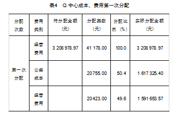 具体分配方法为:Q中心以水库校核洪水位对应的总库容为分配基数,按照汛中限制水位以上至校核洪位对应的调洪水库容占总库容的比例分摊的经营费用作为公共服务的公益成本;按照汛中限制水位以下库容占总库容的比例分配的经营费用作为经营项目成本。这种根据水库设计的相应水位对应相应功能的库容将成本费用在经营项目和公益服务项目之间进行第一次分配,既有合理合规的分配依据,也符合成本核算相关性原则。见表4。