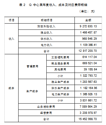 根据表1的分类,对生产和运行管理过程中,Q中心某年度收入、成本及对应费用明细进行具体归类,见表2。