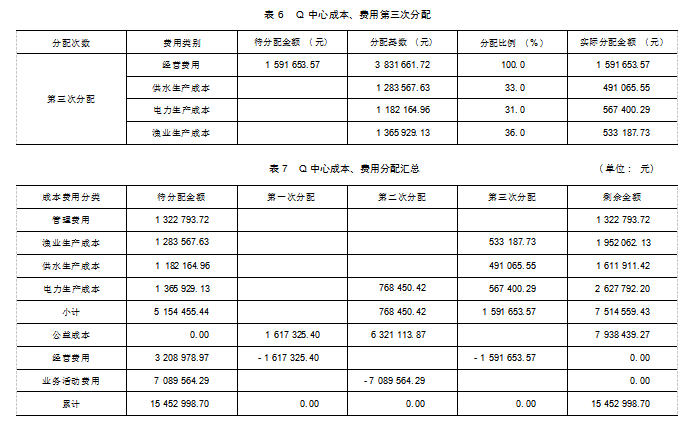 根据特征水位库容功能,将Q中心成本费用按照产生的水位库容功能多层次和收入的多维度进行3次分配核算,依规、科学、合理、准确核算出Q中心公益成本为7 938 439.27元。将Q中心全部成本费用核算进行汇总,见表7。