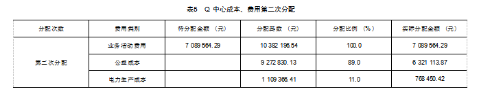 根据Q中心单一水源供水产生的业务活动费用多维度服务对象,将业务活动费用在经营项目和公益服务项目之间进行第二次分配。利用腾空防洪库容弃水发电产生的收入和公益服务收入分别占两者之和的比例将业务活动费用再次进行分配。经过此次分配,充分体现了Q中心日常运行中以公共服务为主的公益性职能,符合成本核算重要性原则(见表5)。